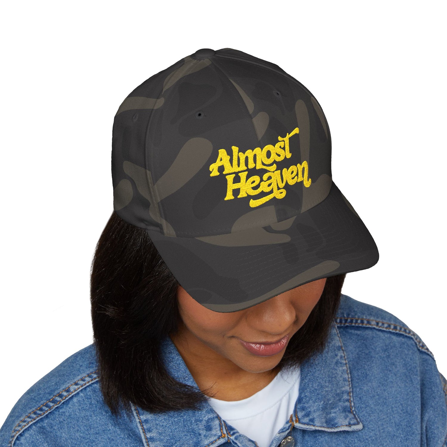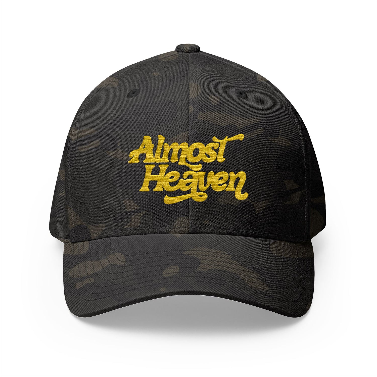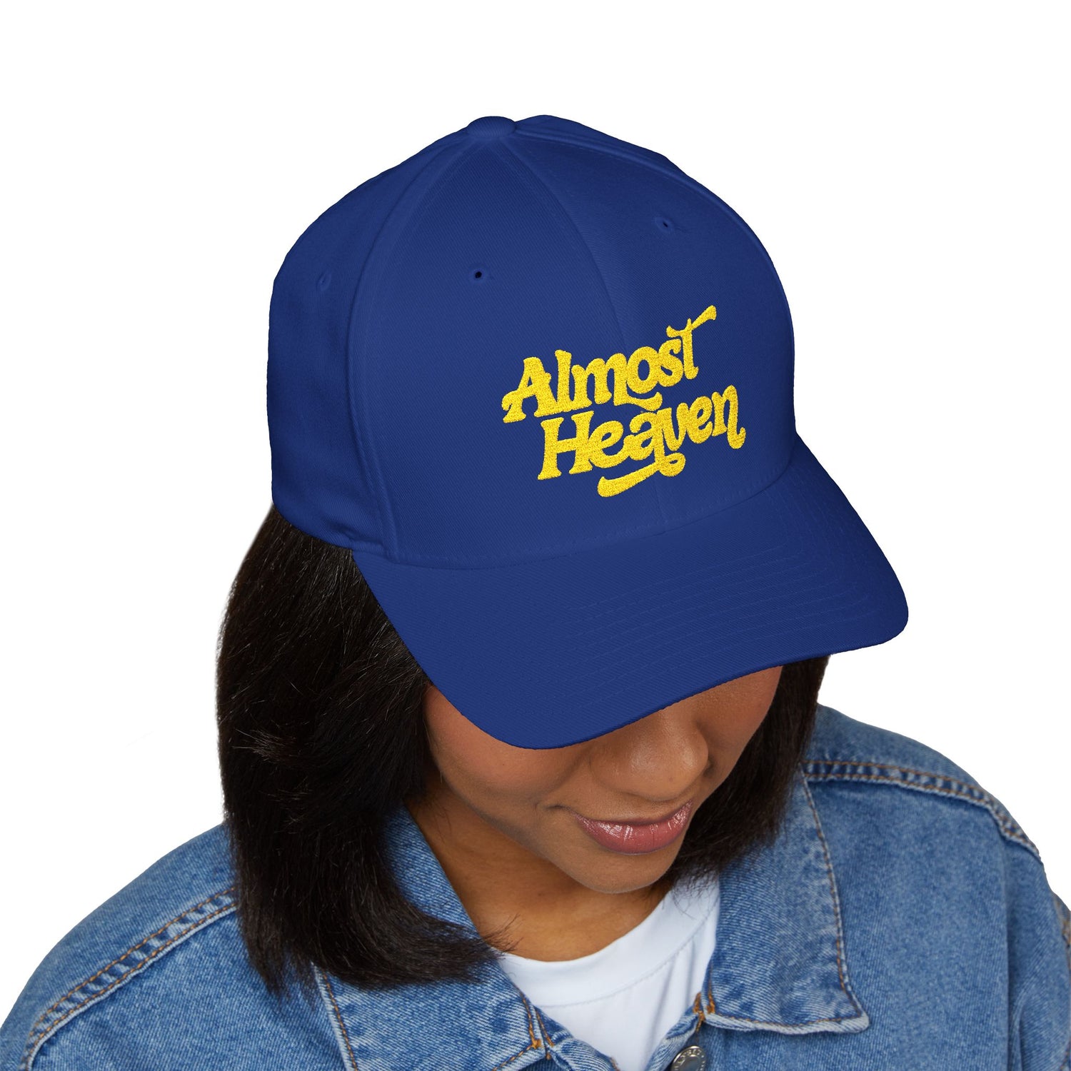 A structured, embroidered cap that brings a relaxed, vintage vibe to everyday wear. The mid-profile six-panel build holds its shape while the curved visor and silver undervisor add subtle polish. Soft, stretchy inner band molds to most head sizes for a comfortable, secure fit that moves with you. The embroidered “Almost Heaven” script — rendered in textured golden stitches — pops against the deep blue fabric, adding a nostalgic, road-trip energy. Wear it on late drives, music nights, or park hangs: it sits low and confident, framing your face without stealing the scene.