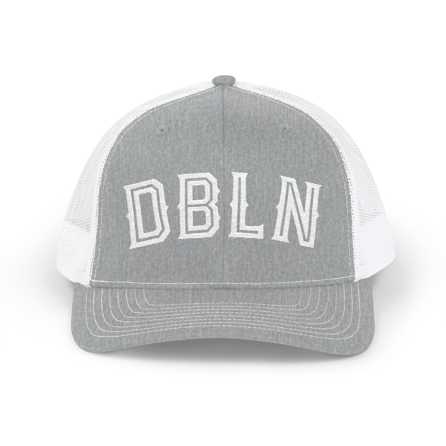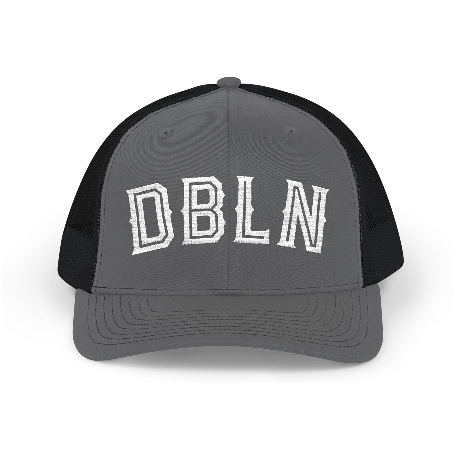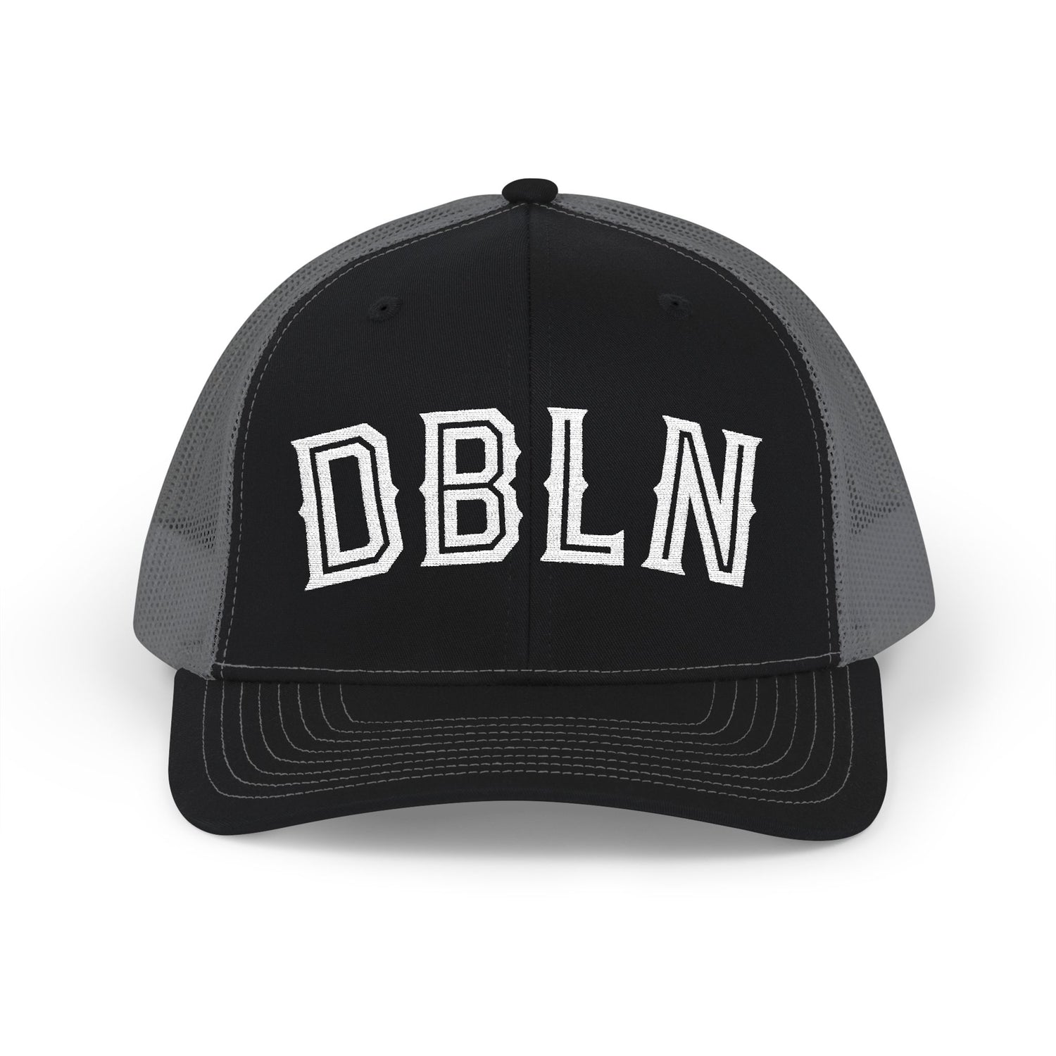 DBLN (outline stroke)_Embroidered-Trucker Snapback Cap — Black Front, White Mesh
